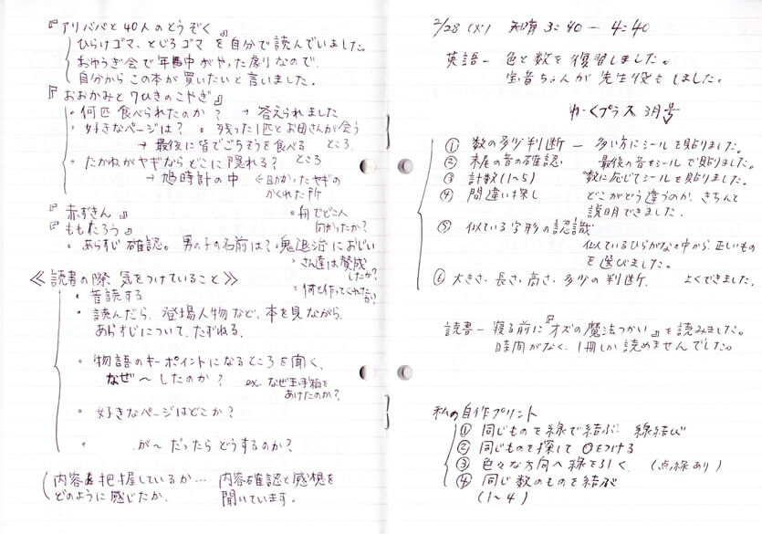 「しつけやお子さまへの知的な働きかけ」のご要望で入会なさった年少女の子さんの会員さまが、担当講師のアドバイスでお嬢様の育児記録をつけていらっしゃるノートです。お嬢様との日々のお取組み内容や気を付けていることなどが丁寧に書き込まれていて素晴らしいです!サリヴァンではお母さまとのコミュニケーションを大切にしています。