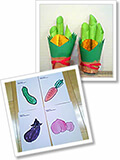 - 「紅白なます」・・・白と橙色のモールを、素材はなんだろう、白いのは大根、橙色は人参、と答えてもらないながら切りました。