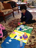2歳のお嬢さんのシール貼りとクレヨン描きです。幼稚園入園まであと丸1年もあるのですが、きちんとお椅子に座って傘の形に丁寧にシールを貼り、クレヨンで雨を降らせていらっしゃいます。クレヨンの持ち方・紙の押さえ方などもとてもしっかりなさってます。「きちんと座ることができる」ことは習慣の積み重ねです。小学校に上がられる時までに必ず身に着けておきたいですね。