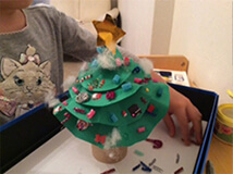 ホームページをご覧になってお問い合わせをいただき、入会なさってもうすぐ1年の4歳の女の子さんがお作りになったスノーボールです。発砲トレイと色つきのアルミホイルを使って作りました。サリヴァンの巧緻性作を含む手先をつかうこと)のお取組みでは紙コップや牛乳パックなど工作の材料として一般的なものはもちろん、日頃おうちであまりお使いにならないものにも親しんでいただくことを大切にしています。出来上がった作品はもちろん、逆さにすると本物と同じようにキラキラが降りてきます。この作品をお作りになったお嬢さまは、レッスンが大好きで毎回のお取組みや工作をいつも楽しみに待っていてくださっています。