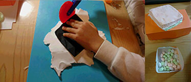今週大好評だったおみくじつくりのS先生レポートです。おみくじの箱は正四角柱で作りました。まずは見本を見て、どんな形をいくつ使っているか長四角と正方形の厚紙を使って調べ、マスキングテープで留めて展開図を確認してから製作を始めました。ハサミで展開図を切り抜き、箱を作り、当たりのくじにしるしをつけて、くじを入れて完成!おみくじで遊んだあとは、展開図のおさらいです。展開図はどんな形だった?長方形はいくつ使った?正方形は?出来上がったおみくじの箱を上からみるとどんな形?横からみると? 楽しみながら、難しい図形の問題ができました!